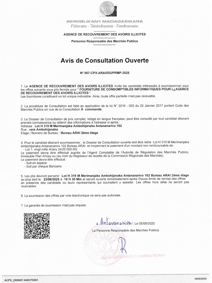 Les plis devront parvenir au Lot H 319 Merimanjaka Ambohijanaka Antananarivo 102, Bureau ARAI 2ème étage au plus tard le 23/06/2025 à