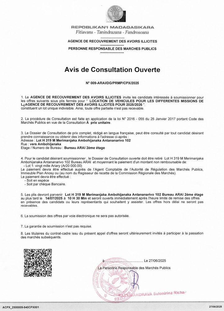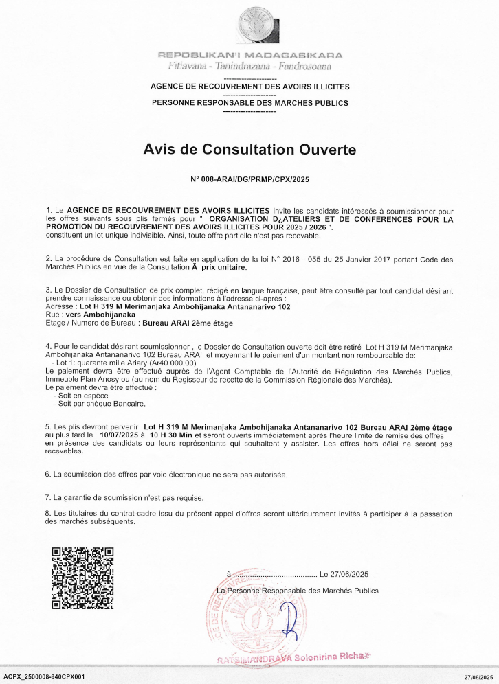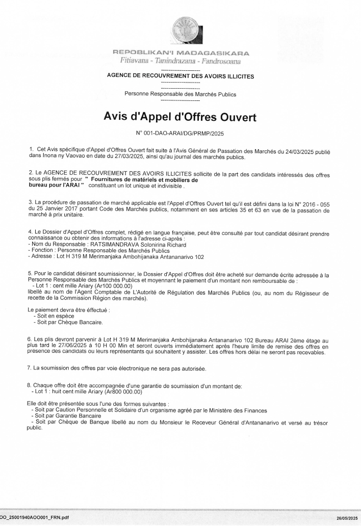 Les plis devront parvenir au Lot H 319 Merimanjaka Ambohijanaka Antananarivo 102, Bureau ARAI 2ème étage au plus tard le 10/07/2025 à
