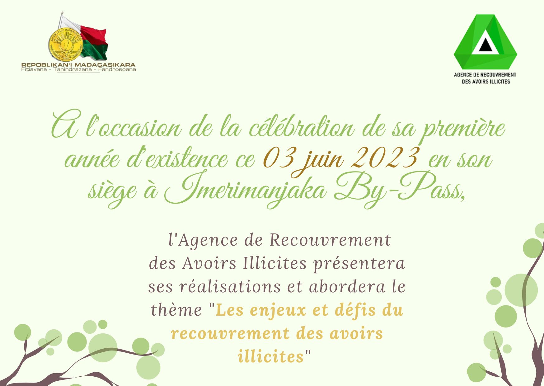 A l'occasion de la célébration de sa première année d'existence ce 03 juin 2023 à partir de 09h00, en son siège à Imerimanjaka, l'Agence de Recouvrement des Avoirs Illicites présentera ses réalisations et abordera le thème "Les enjeux et défis du recouvrement des avoirs illicites".