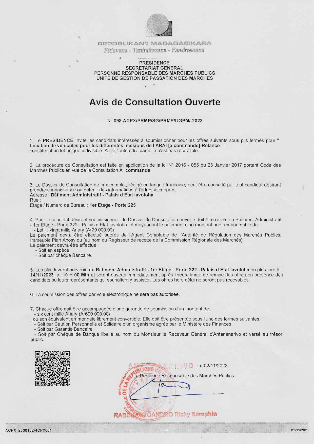 La présidence invite les candidats intéressés à soumissionner pour les offres suivants sous plis fermés pour: "Location de vehicules pour les différentes missions de l'ARAI [à la Commande]-Relance".
