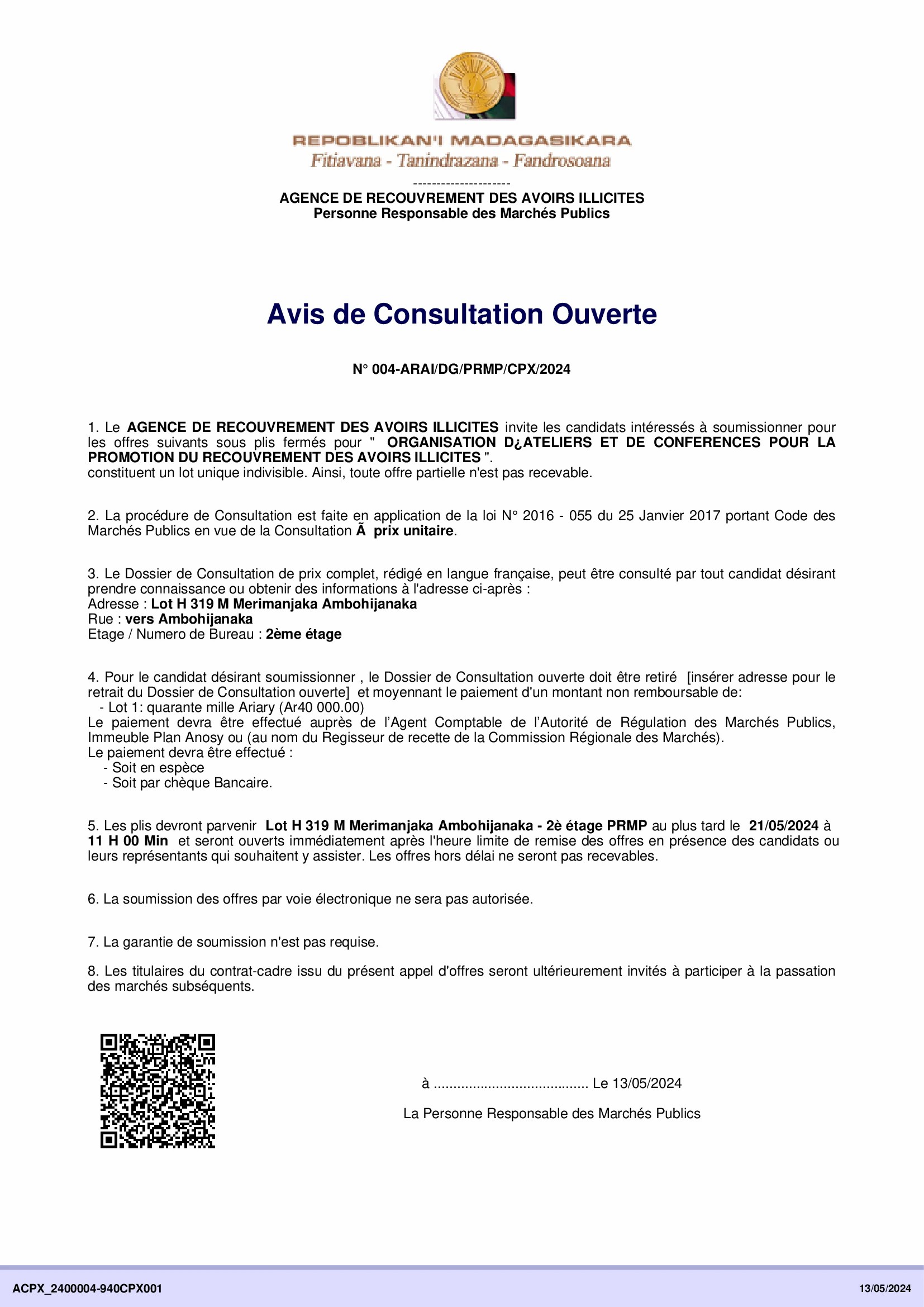 Les plis devront parvenir au Lot H 319 Merimanjaka Ambohijanaka, 2è étage PRMP au plus tard le 21 mai 2024 à 11 heures et seront ouverts immédiatement après l'heure limite de remise des offres en présence des candidats ou leurs représentants qui souhaitent y assister.