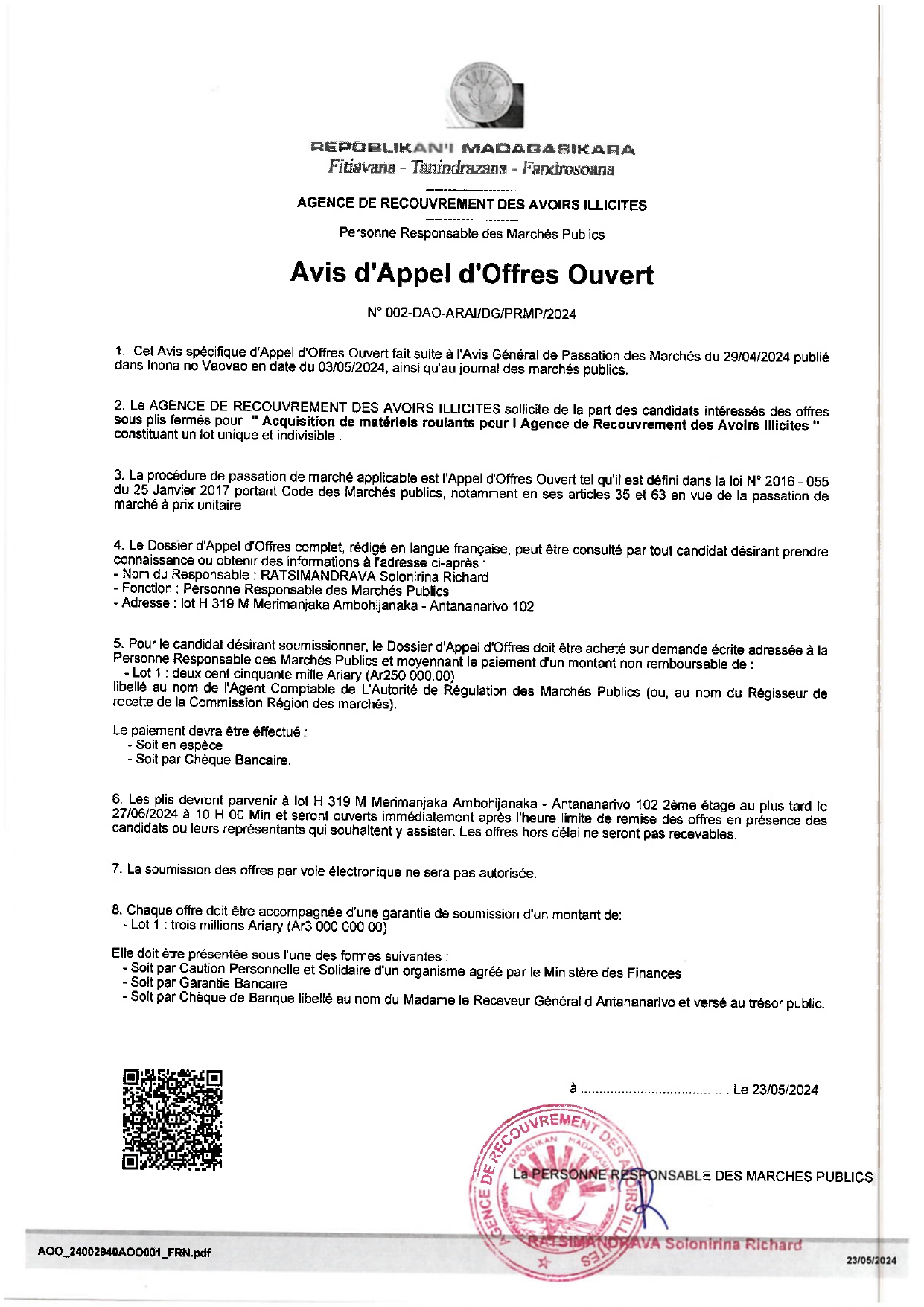 L'Agence de Recouvrement des Avoirs Illicites invite les candidats intéressés à soumissionner pour les offres suivants "Acquisition de matériels roulants pour L'Agence de Recouvrement des Avoirs Illicites"