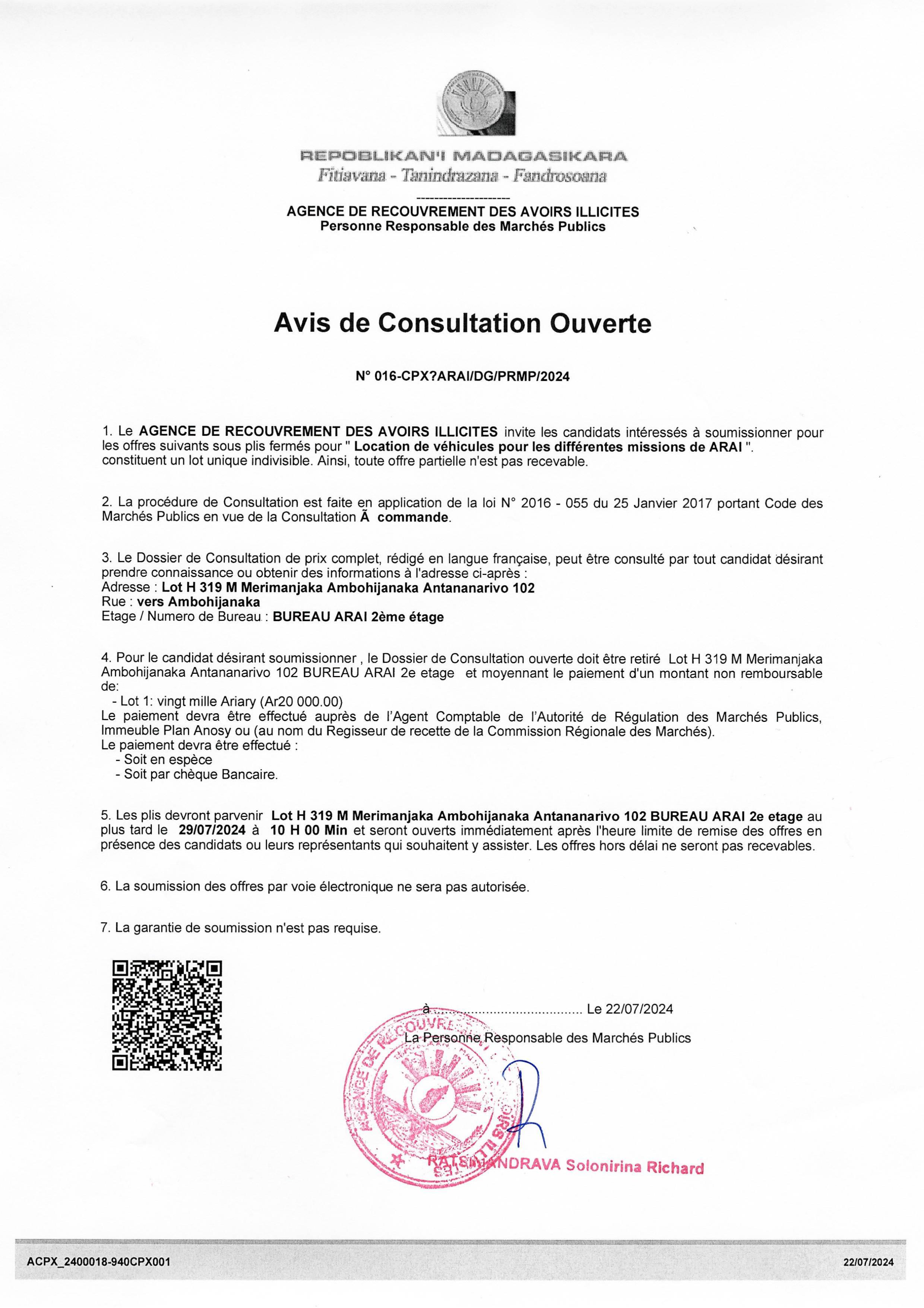 L'Agence de Recouvrement des Avoirs Illicites invite les candidats intéressés à soumissionner pour les offres suivants "Location de véhicules pour les différentes missions de l'ARAI"