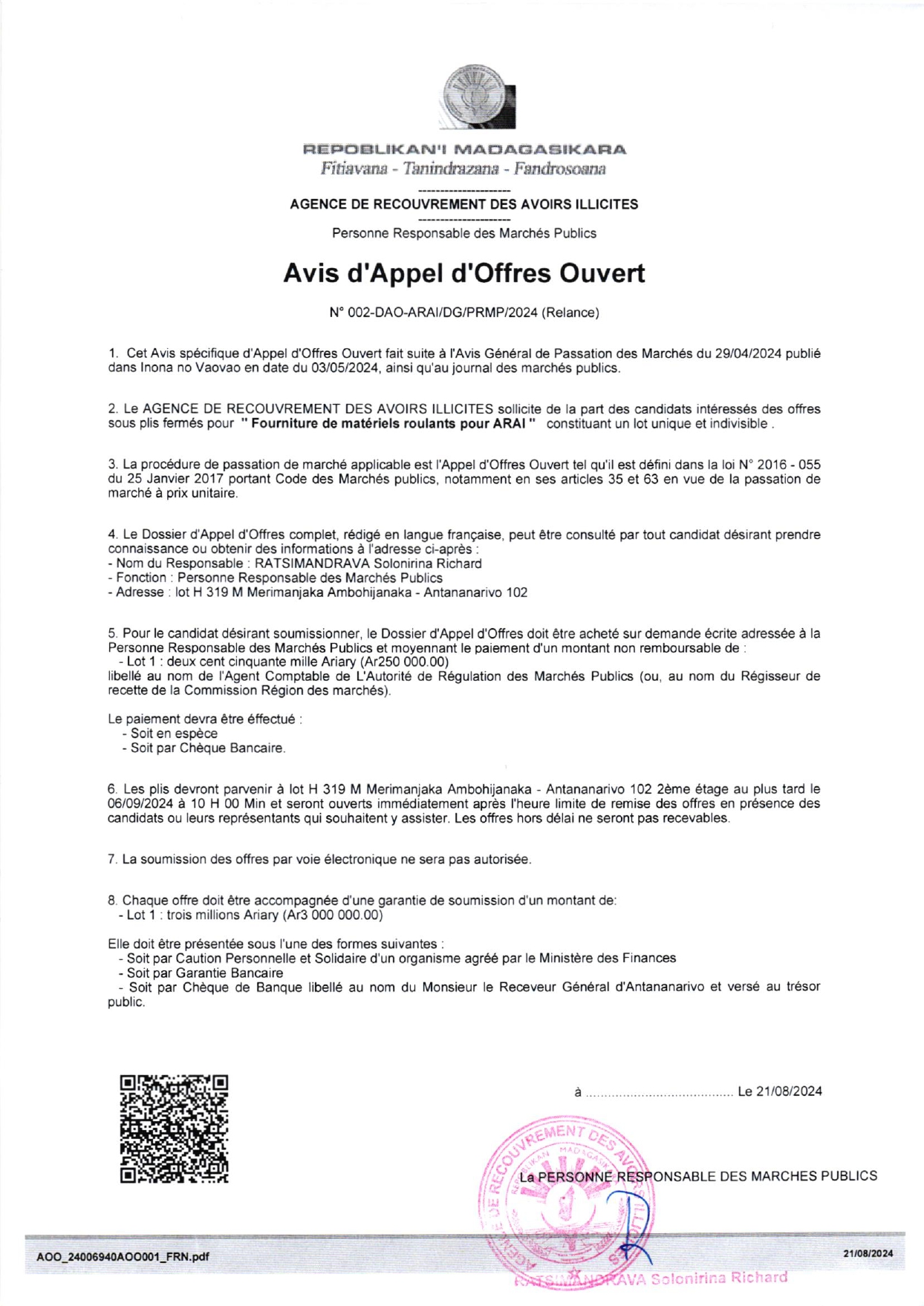 L'Agence de Recouvrement des Avoirs Illicites invite les candidats intéressés à soumissionner pour les offres suivants "Fourniture de matériels roulants pour ARAI"
