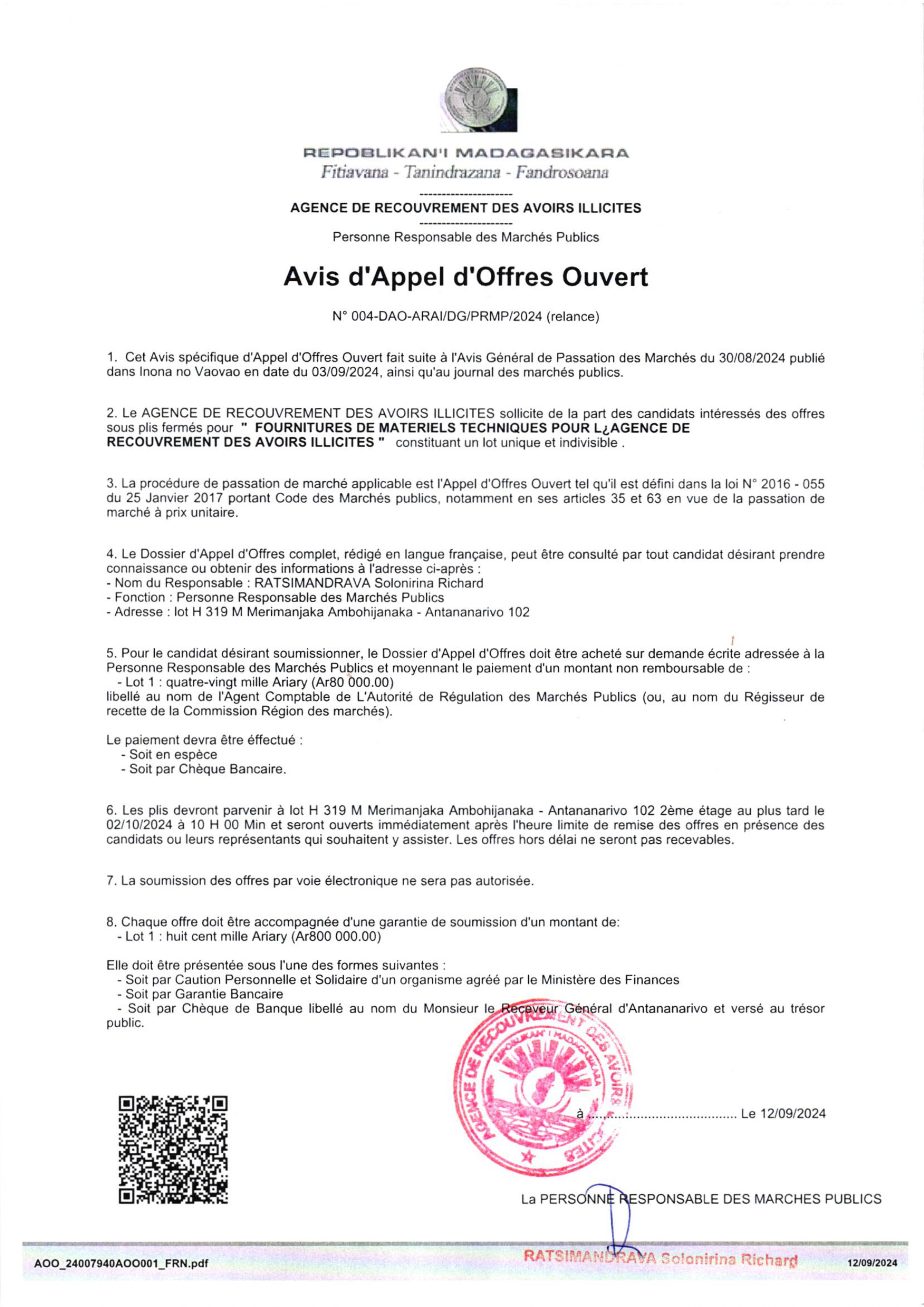 Les plis devront parvenir au Lot H 319 Merimanjaka Ambohijanaka Antananarivo 102, Bureau ARAI 2ème étage au plus tard le 02 octobre 2024 à 10 heures et seront ouverts immédiatement après l'heure limite de remise des offres en présence des candidats ou leurs représentants qui souhaitent y assister.