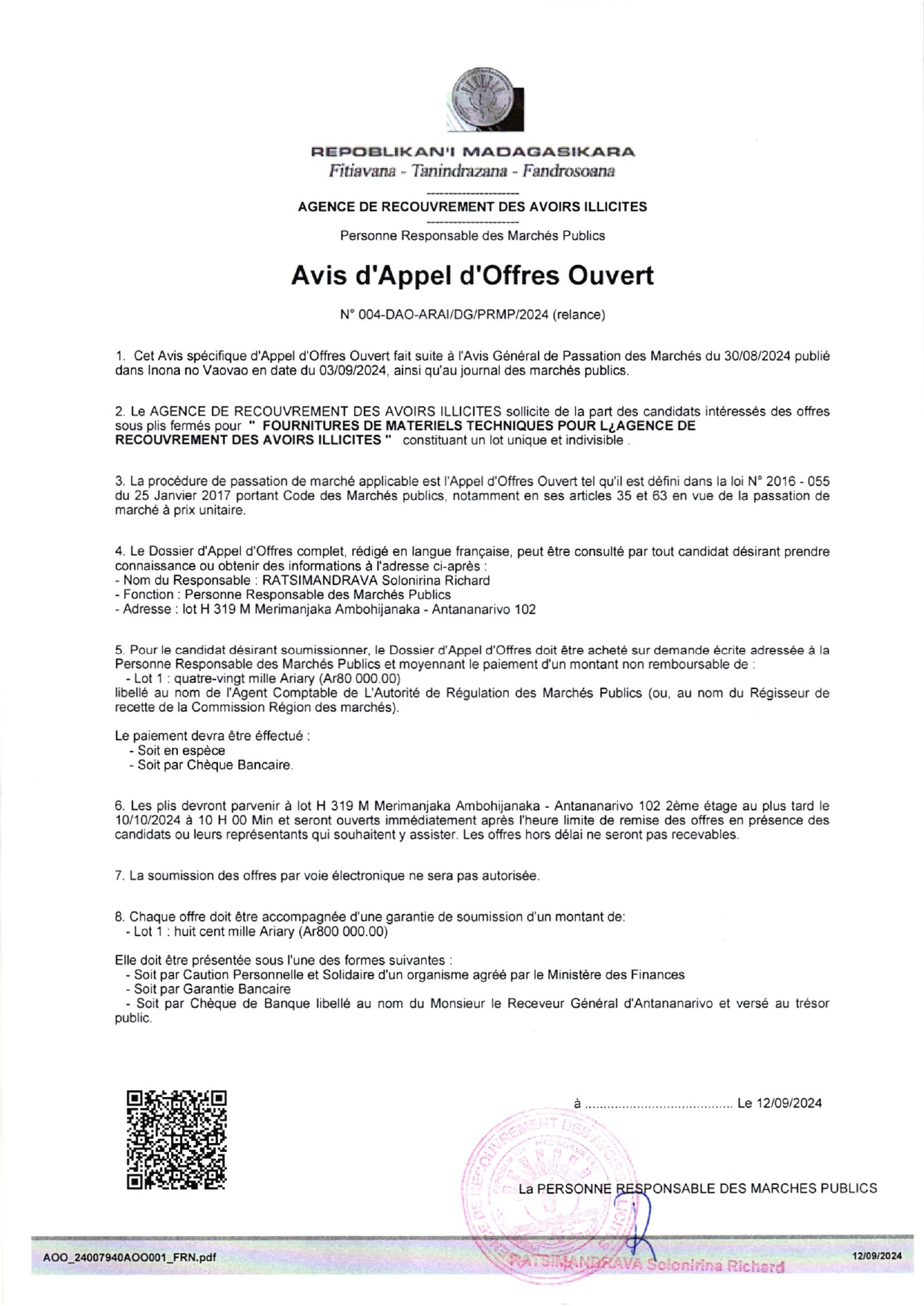 Les plis devront parvenir au Lot H 319 Merimanjaka Ambohijanaka Antananarivo 102, Bureau ARAI 2ème étage au plus tard le 10 octobre 2024 à 10 heures et seront ouverts immédiatement après l'heure limite de remise des offres en présence des candidats ou leurs représentants qui souhaitent y assister.