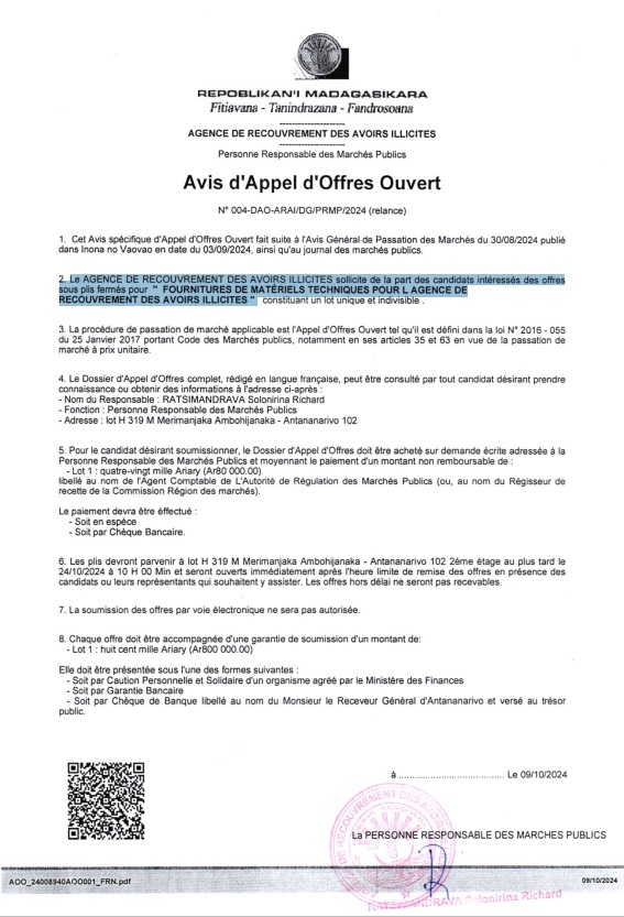 Les plis devront parvenir à lot H 319 M Merimanjaka Ambohijanaka - Antananarivo 102 2ème étage au plus tard le 24/11/2024 à 10H00 Min