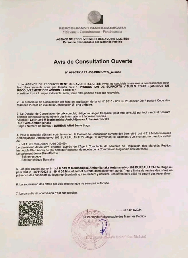 Les plis devront parvenir au Lot H 319 Merimanjaka Ambohijanaka Antananarivo 102, Bureau ARAI 2ème étage au plus tard le 25 novembre 2024 à 10 heures et seront ouverts immédiatement après l'heure limite de remise des offres en présence des candidats ou leurs représentants qui souhaitent y assister.