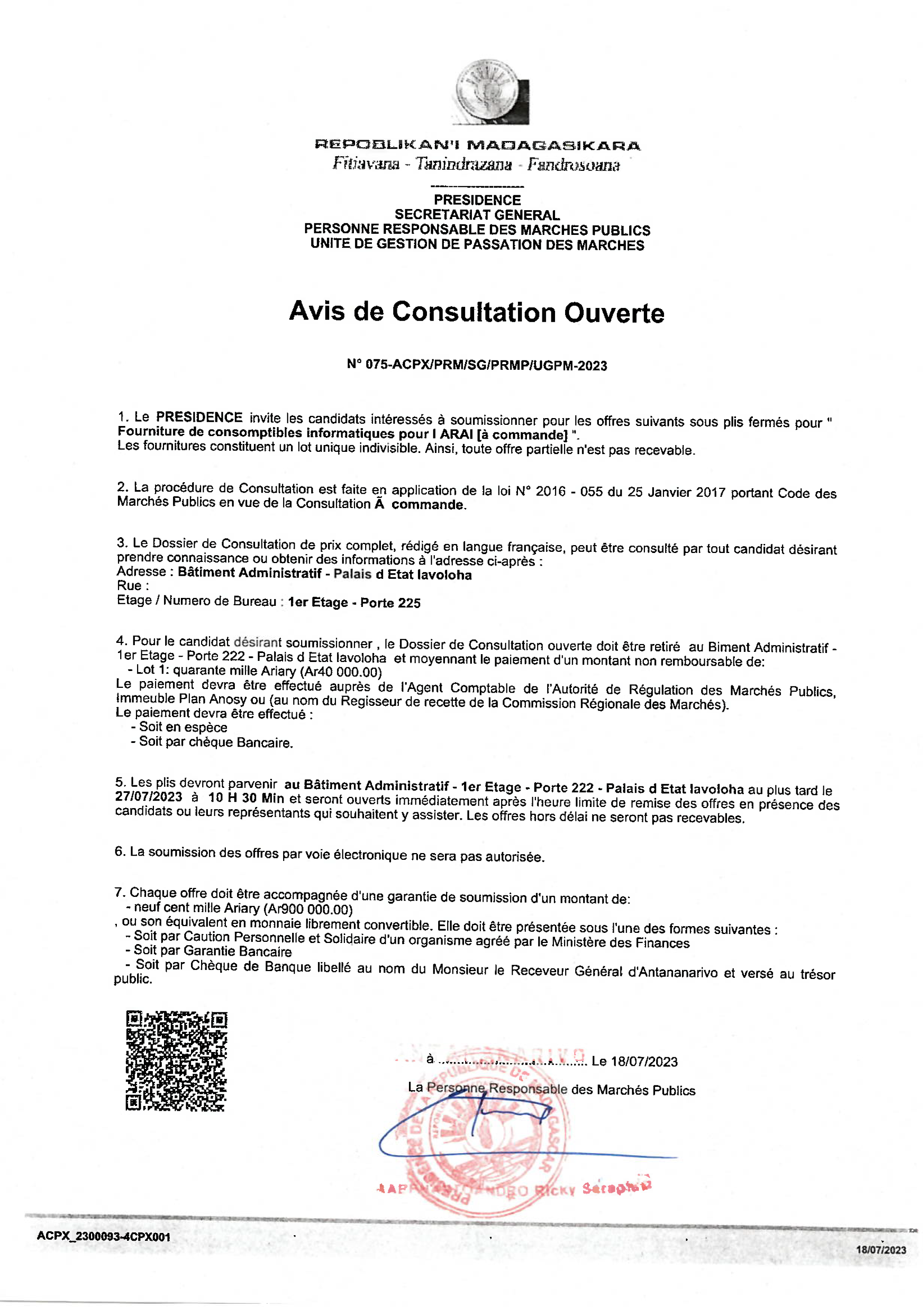 La présidence invite les candidats intéressés à soumissionner pour les offres suivants sous plis fermés pour "Fournitures de consomptibles Informatiques pour l'ARAI [à la commande]"