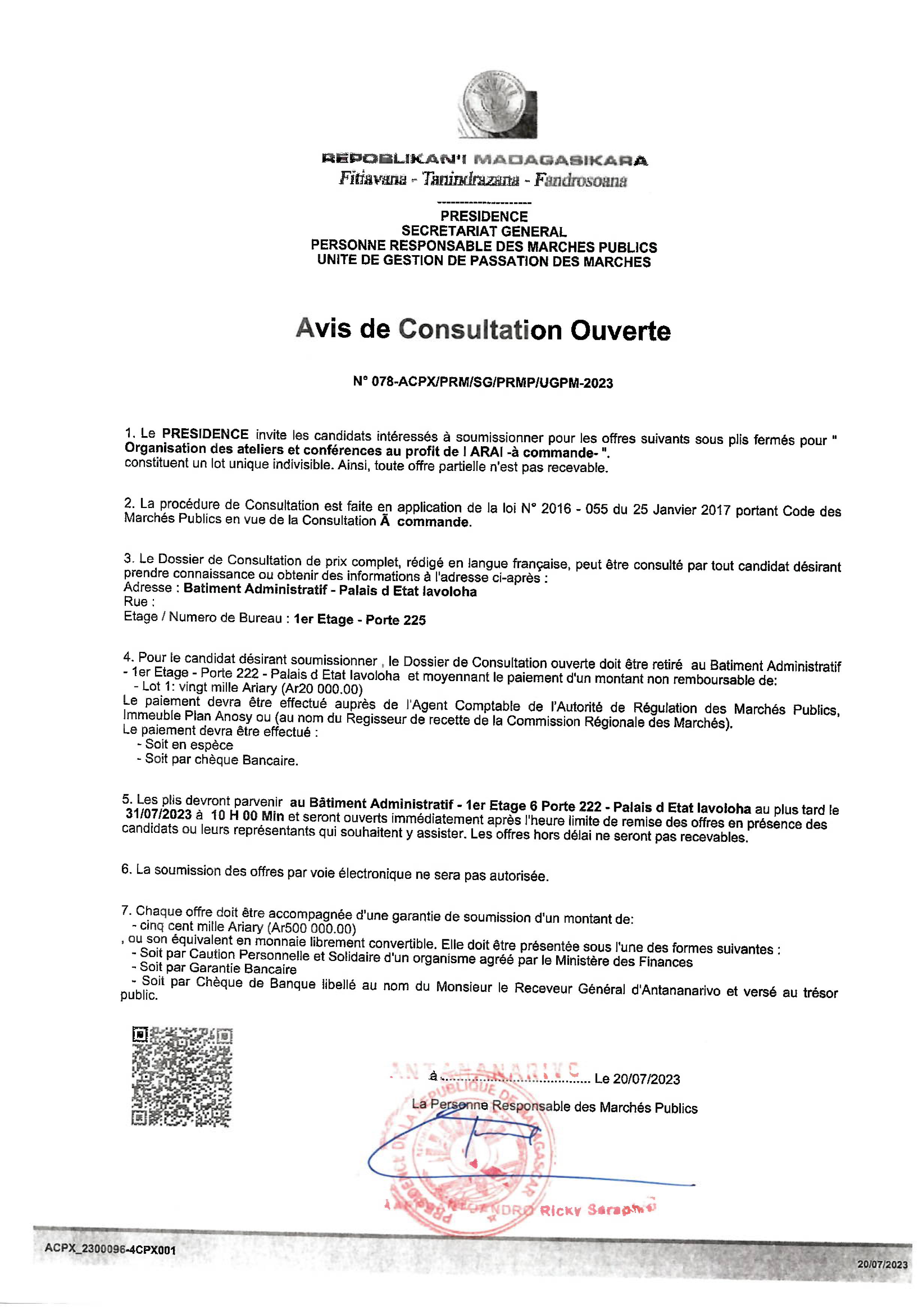 La présidence invite les candidats intéressés à soumissionner pour les offres suivants sous plis fermés pour "Organisation des ateliers et conférences au profit de l'ARAI [à la commande]"