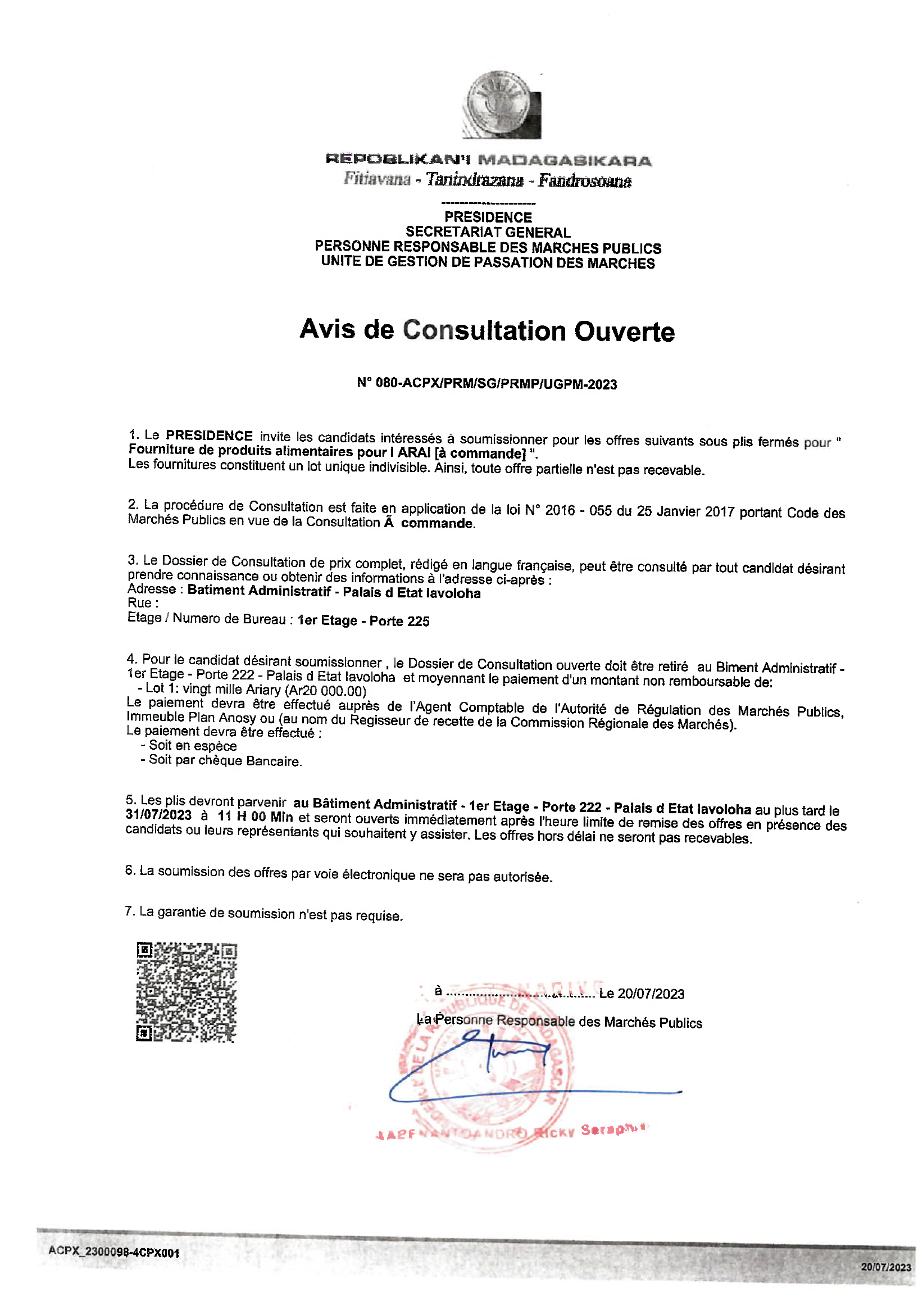 La présidence invite les candidats intéressés à soumissionner pour les offres suivants sous plis fermés pour "Fourniture de produits alimentaires pour l'ARAI [à la commande]"