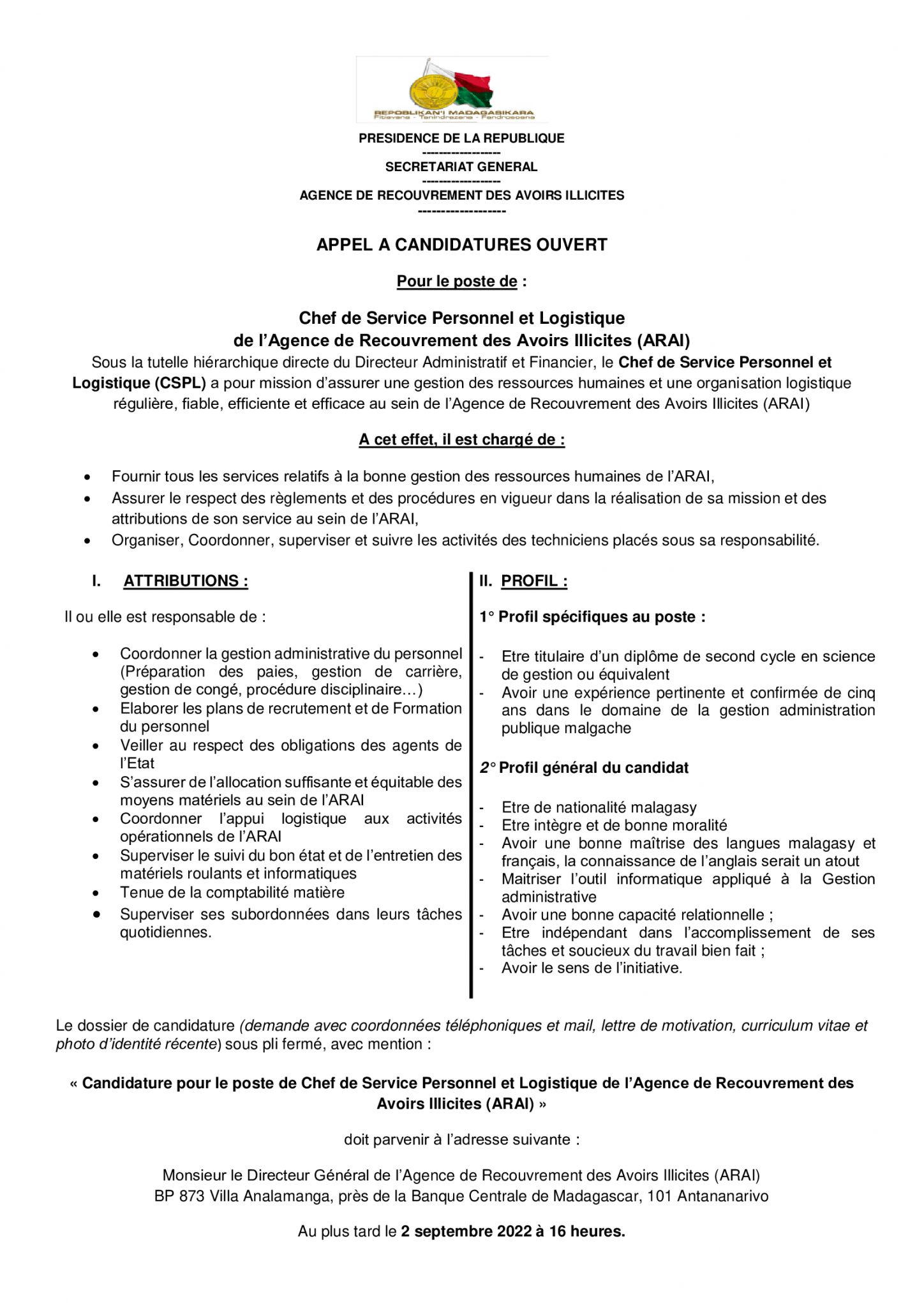 Sous la tutelle hiérarchique directe du Directeur Administratif et Financier, le Chef de Service Personnel et Logistique (CSPL) a pour mission d’assurer une gestion des ressources humaines et une organisation logistique régulière, fiable, efficiente et efficace au sein de l’Agence de Recouvrement des Avoirs Illicites (ARAI).