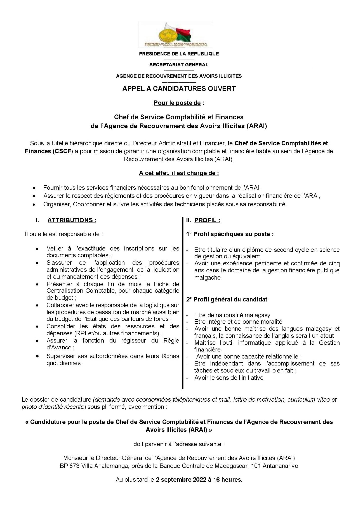 Sous la tutelle hiérarchique directe du Directeur Administratif et Financier, le Chef de Service Comptabilités et Finances (CSCF) a pour mission de garantir une organisation comptable et financière fiable au sein de l’Agence de Recouvrement des Avoirs Illicites (ARAI).