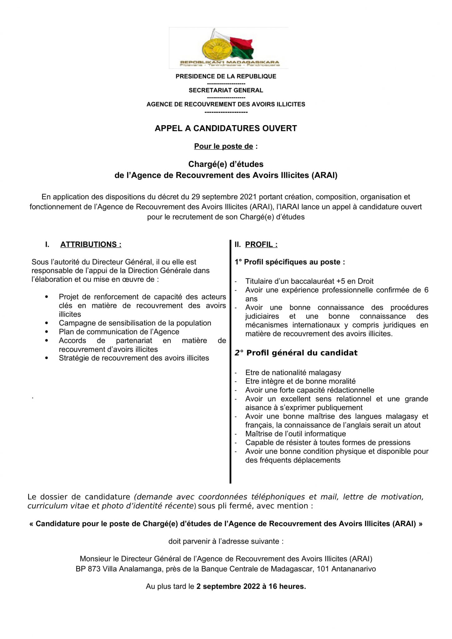 En application des dispositions du décret du 29 septembre 2021 portant création, composition, organisation et fonctionnement de l’Agence de Recouvrement des Avoirs Illicites (ARAI), l’ARAI lance un appel à candidature ouvert pour le recrutement de son Chargé(e) d’études